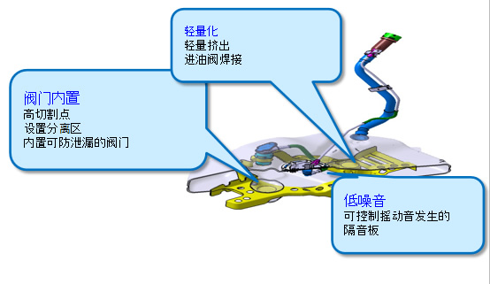 为对应北美的HC渗透的LEVⅢ法规,将构成零件进行内置燃油箱内,从而开发的低渗透燃油箱。并且,低公害 高燃油性汽车由于配置了怠速停止功能,会引起油箱内的燃油摇动音的发生,为提高控制摇动音,在油箱内嵌入了隔音板,从面实现了轻量化技术同步开发的同时,也将燃油系统更进一步提高。